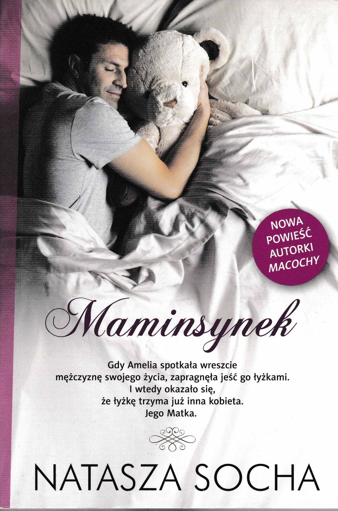 To ciekawe, bo ja na końcu swojego wyczuwam słowo „spi****laj”.” Natasza Socha napisała książkę niebanalną lecz taką z życia wziętą. Ukazuje portret typowego maminsynka, można powiedzieć, że rozkłada jego życie na czynniki pierwsze. Ponieważ maminsynkiem nie staje się z dnia na dzień, do tego dąży się drobnymi kroczkami od samych narodzin. Pokazuje jak ważne jest, aby dziecko posiadało dwoje rodziców, nie tylko matkę, która odnajduje się zarówno w roli swojej jak i ojca. Dodatkowo przedstawione są dogłębnie relacje w tzw. „trójkącie”, czyli kobieta+ mężczyzna+ teściowa. Styl jakim posługuje się autorka bardzo przypadł mi do gustu. Książkę czyta się szybko i przyjemnie. Bohaterowie są doskonale wykreowani. Zakończenie zaskakuje. Dopełnieniem całości jest szata graficzna książki, która idealnie pasuje do przedstawionej historii. Z tą publikacją powinny się zaznajomić przede wszystkim kobiety. Mężczyźni też mogą sięgnąć po „Maminsynka” będą mogli spojrzeć na to wszystko z innej strony- jak to wygląda z perspektywy kobiety, a także przekonać się czy sami cierpią na syndrom maminsynka. Cóż mogę więcej dodać? Książka jest niesamowita, po jej zakończeniu jestem w pełni usatysfakcjonowana. Szczerze polecam.